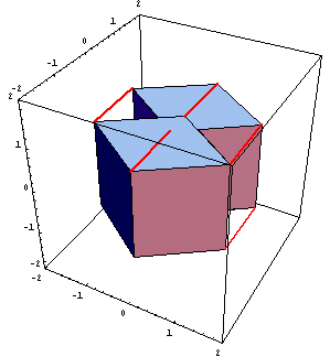 This animation shows the same motion of the 4-dimensional cube as the animation cube4. However, only two boundary surfaces of the cube are represented as non-transparent 3-dimensional cubes. The rest of the boundary surfaces is omitted and only edges between the vertices of the 4-cube are drawn.